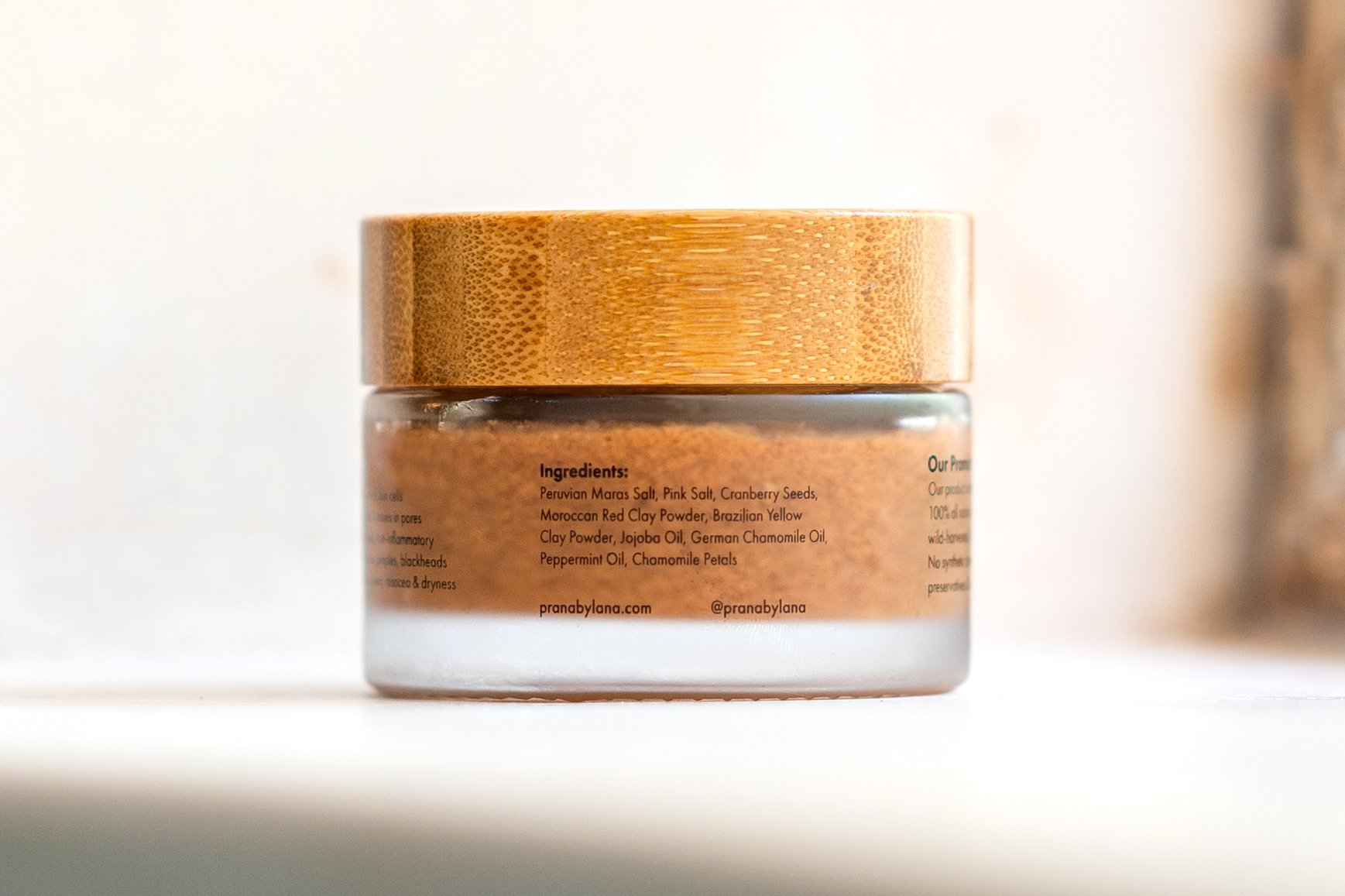 Peruvian Maras Salt, Himalayan Pink Salt, Cranberry Seeds, Brazilian Red Clay Powder, Brazilian Yellow Clay Powder, Jojoba Oil, German Chamomile Oil, Peppermint Oil, Chamomile Petals