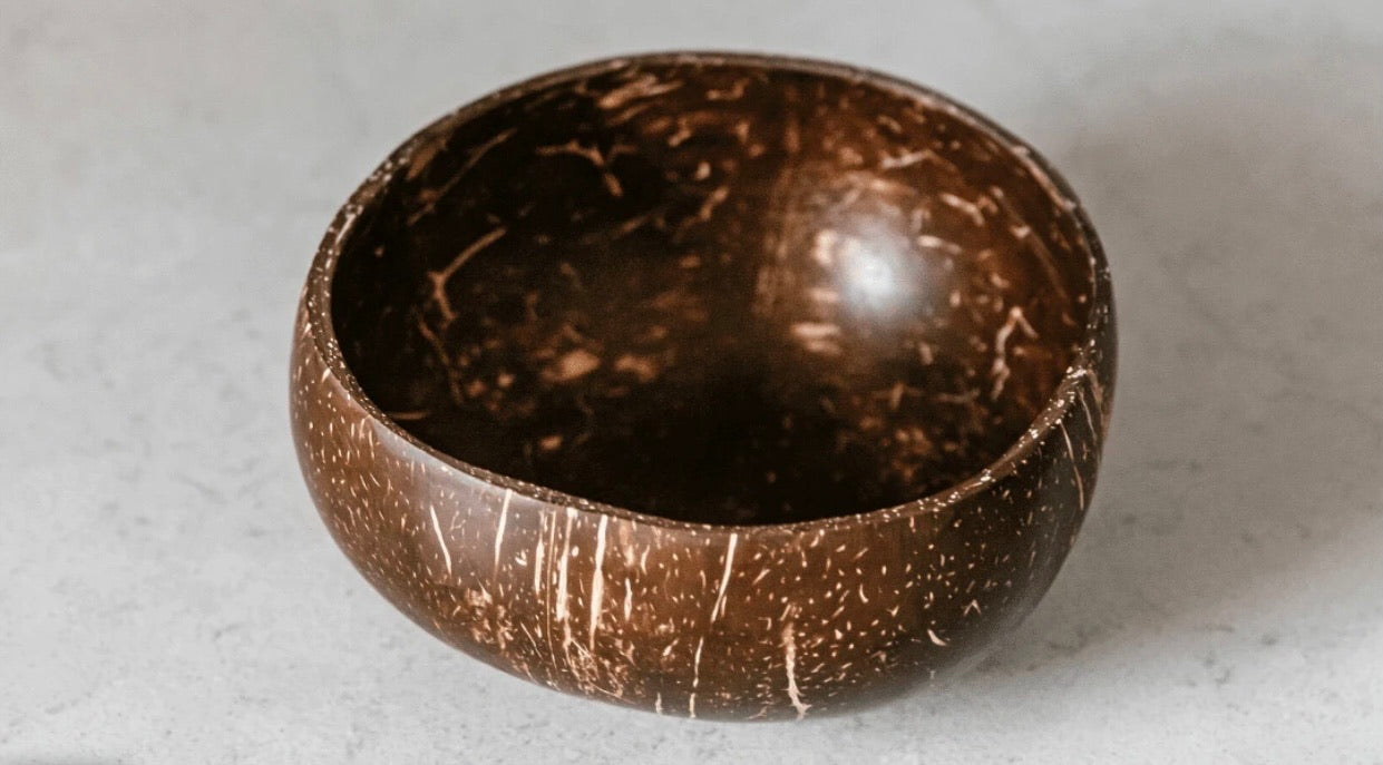Coconut bowls are made by hand from the shells of coconuts that have been harvested for their meat and milk. The shells are cleaned and dried, and then sanded and polished to create a smooth finish. Typically the coconut shells would be thrown away but by turning them into bowls we are recycling and creating sustainable bowls!
