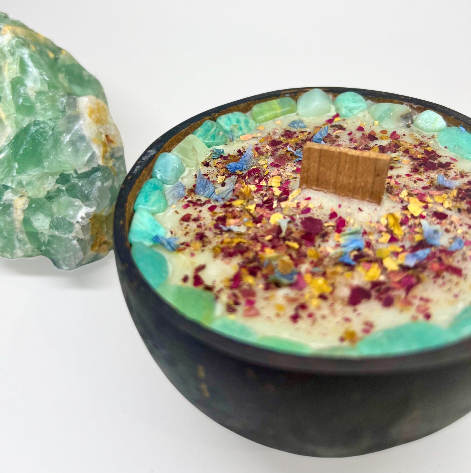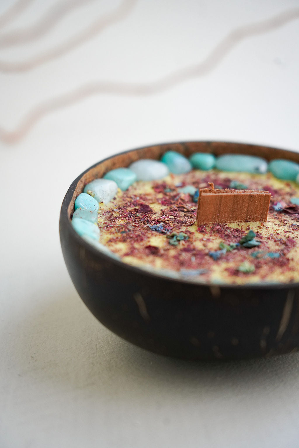 *Each and every candle with slightly vary from the photos. Every coconut shell will slightly vary in color, texture, shape & size. Since all the ingredients and crystals used are all pure from nature they also may slightly vary in their own unique color, size & formation*
