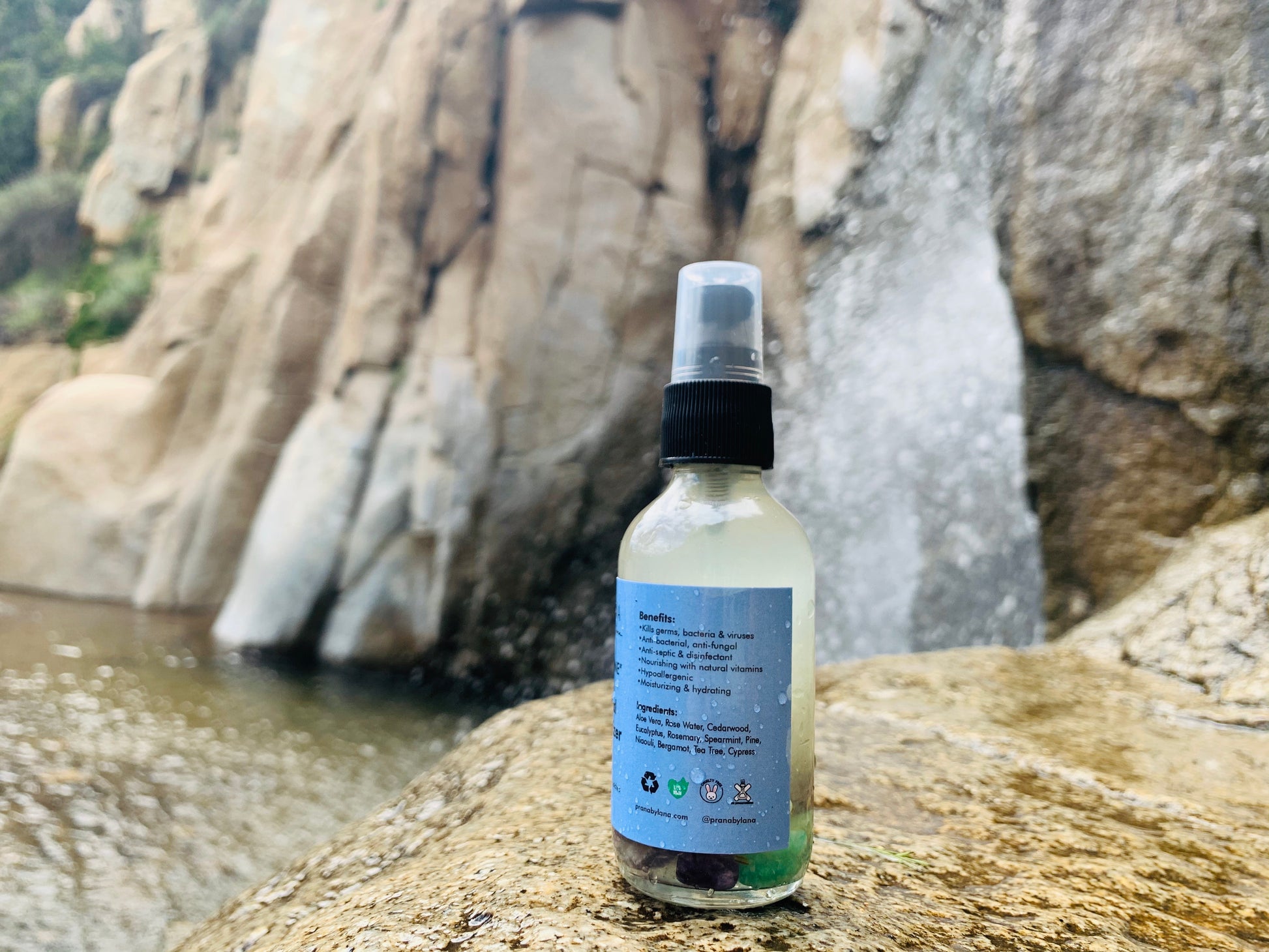 Aloe Vera extract, Rosewater, Bergamot, Eucalyptus, Rosemary, Pine, Cedar wood, Spearmint, Niaouli, Tea Tree, Cypress