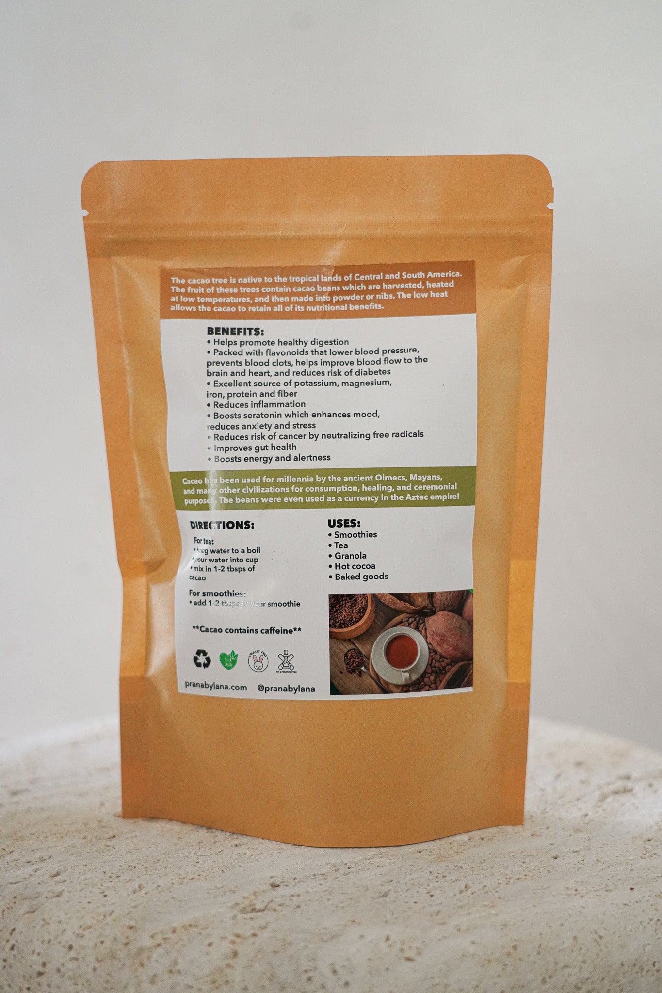 The cacao tree is native to the tropical lands of Central and South America. The fruit of these trees contain cacao beans which are harvested, heated at low temperatures, and then made into powder or nibs. The low heat allows the cacao to retain all of its nutritional benefits.