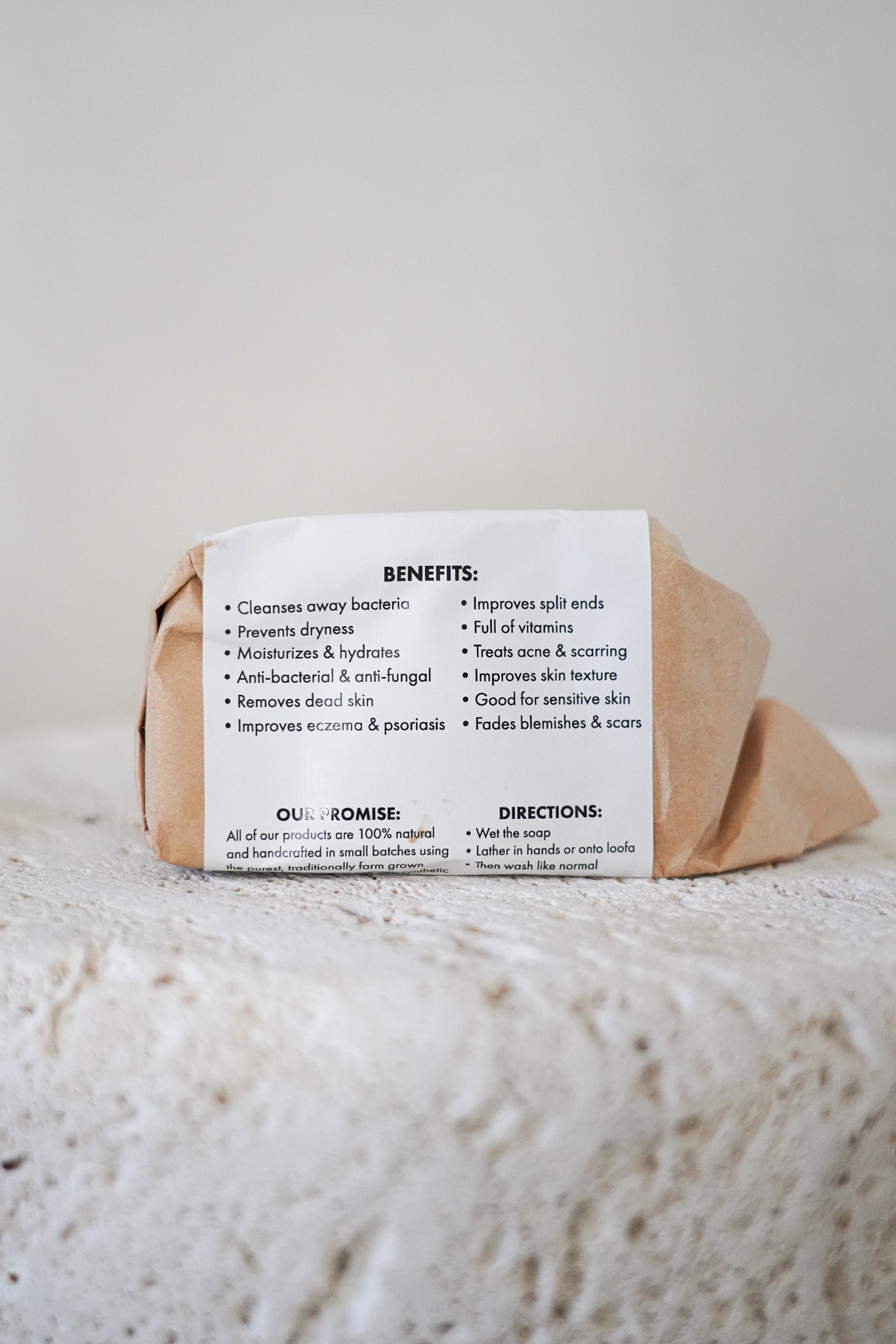This Premium Raw African Black Soap is made by indigenous women's hands in Ghana from a traditional African recipe & techniques that have been passed down for many generations. It does not contain any artificial fragrances. We source directly from the village and support the women and their families. All profits from each bar purchased goes towards improving the livelihoods of the Ghanian villagers families and children.