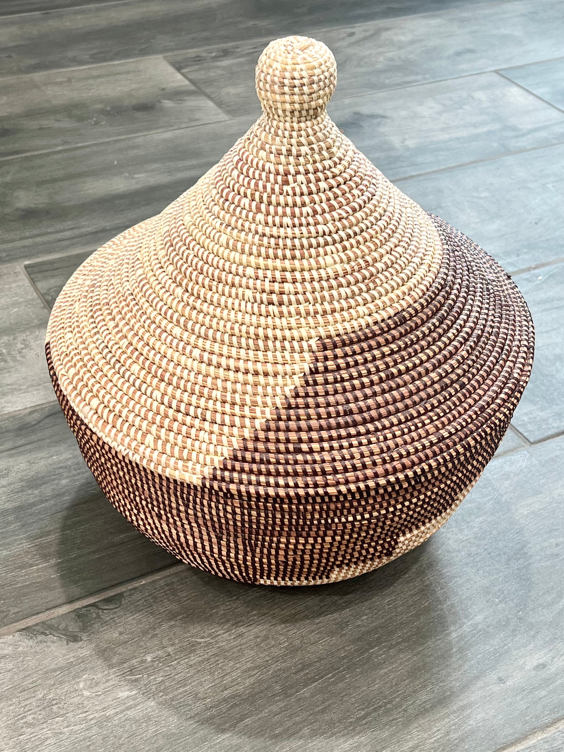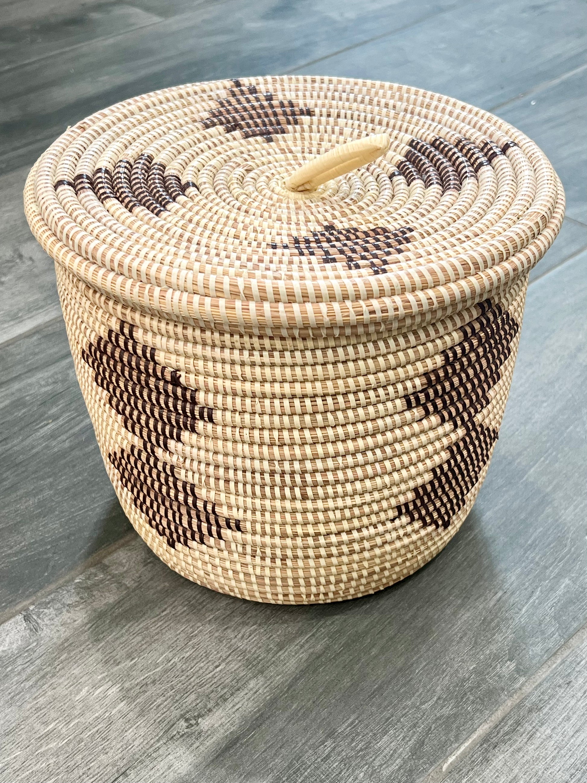 Every basket is a reflection of fair trade principles, meticulously handmade by talented Wolof artisans. Designed for versatility and functionality, each basket features a fitted lid and inset woven handles, making them perfect for storage or as a decorative item in your home.